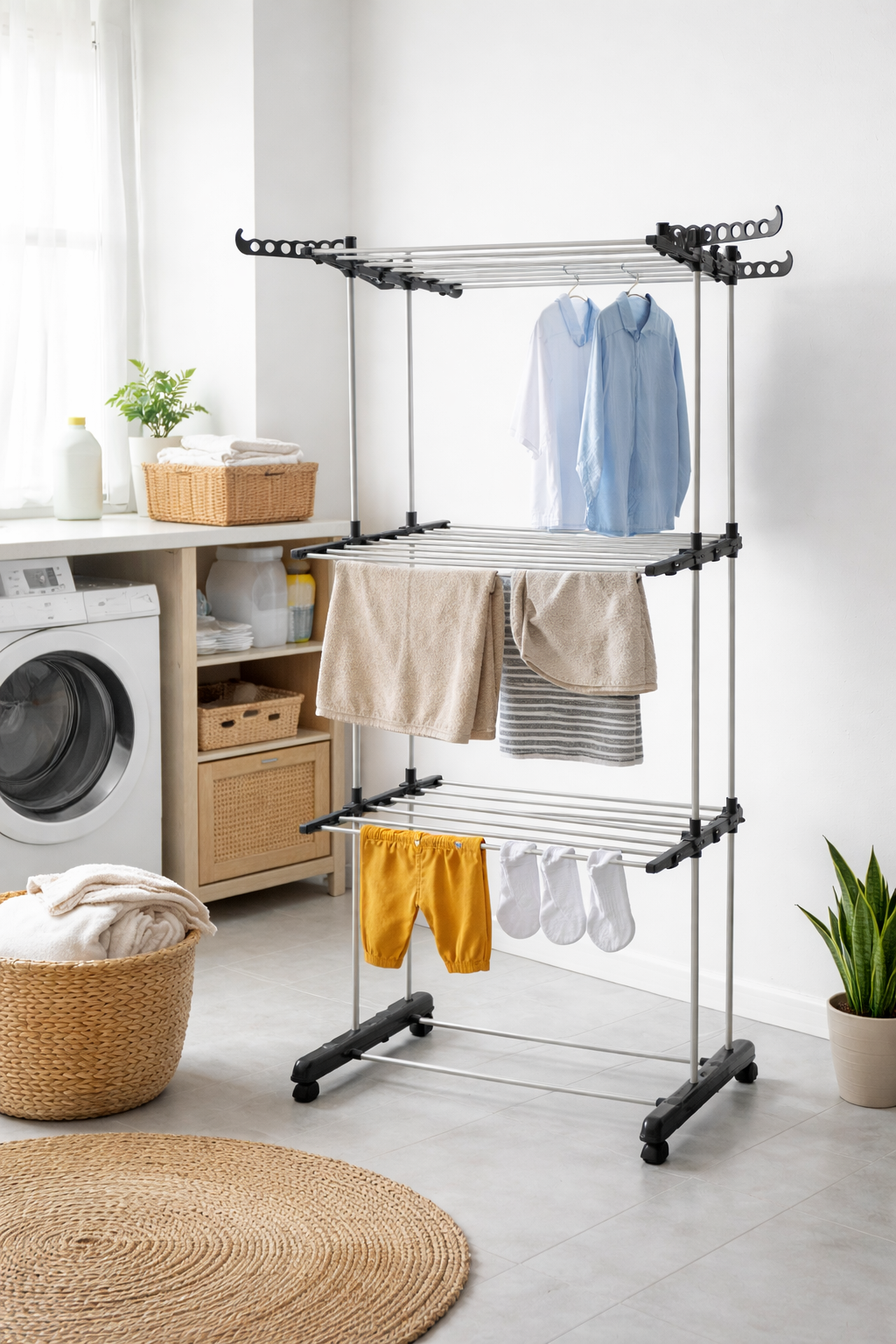 ✔️Sturdy and Stable: Designed with non-slip feet for added stability on any indoor or outdoor surface. The durable structure ensures your clothes dryer remains sturdy during use.